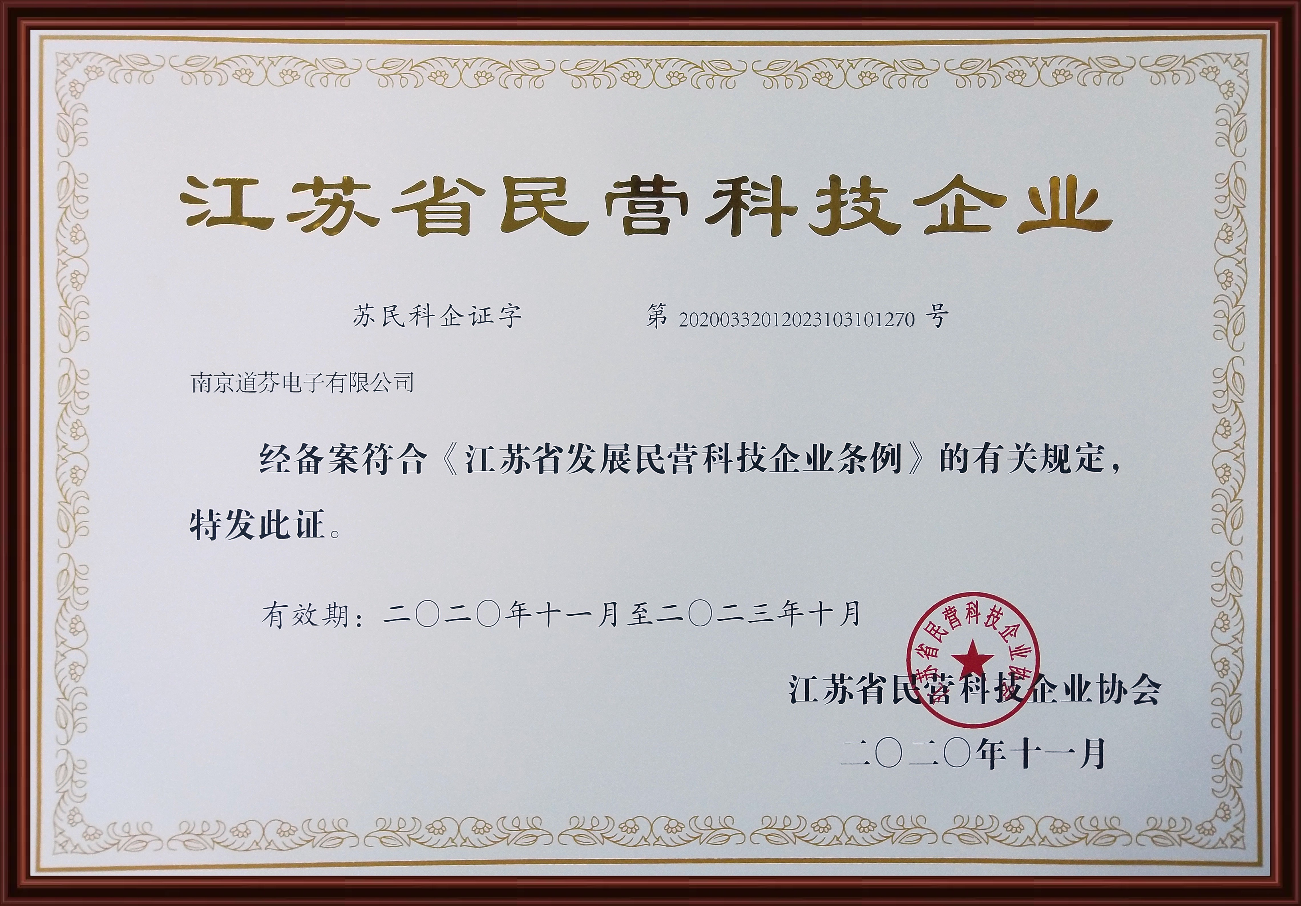 熱烈祝賀南京道芬獲得“2020江蘇省民營科技企業”稱號
